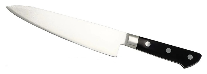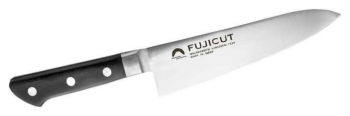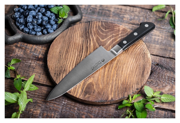 Шеф-поварской нож гюйто Fuji Cutlery FC-1045 серии Reigetsu используется на предприятиях общественного питания и в домашних условиях для первичной разделки крупных кусков мяса, птицы и овощей. Модель оснащена широким однослойным лезвием и острием с округлым верхом. Изделие не рекомендуется мыть в посудомоечной машине. Клинок выполнен из высококачественной нержавеющей стали марки Mo-V с содержанием молибдена и ванадия, рукоятка – из прочного полимера – полиоксиметилена (POM) черного цвета. Особенности: