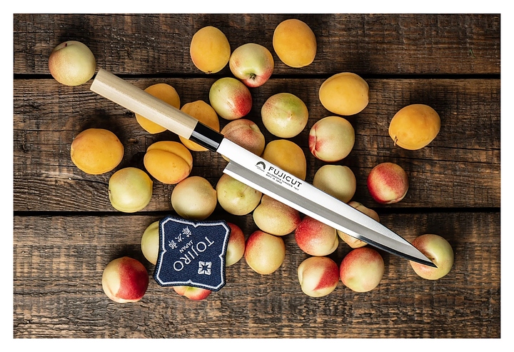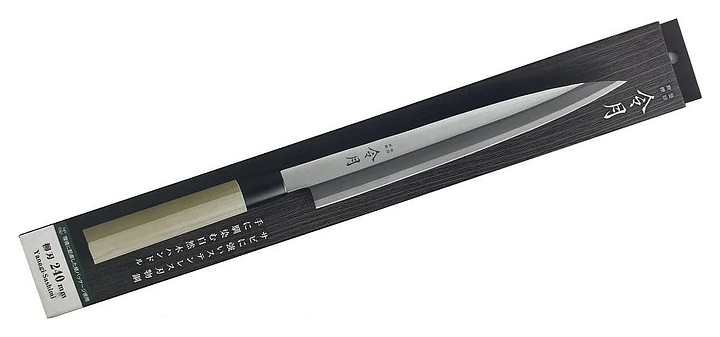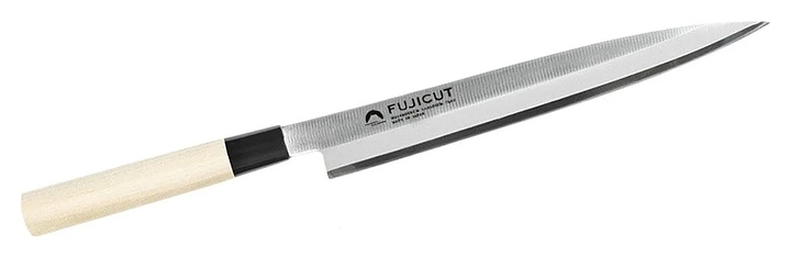 Нож янагиба Fuji Cutlery FC-1077 серии Reigetsu используется на предприятиях общественного питания и в домашних условиях для филейной разделки рыбы. Модель оснащена узким однослойным лезвием кинжальной формы. Изделие не рекомендуется мыть в посудомоечной машине. Клинок выполнен из высококачественной нержавеющей стали марки Mo-V с содержанием молибдена и ванадия, рукоятка – из древесины с обжимным кольцом из черного полимера. Особенности: