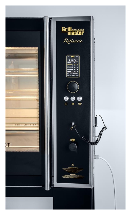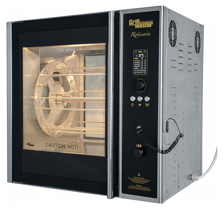 Электрический гриль Grill Master Ф3кэл/1 предназначен для приготовления кур-гриль и субпродуктов в заведениях быстрого питания и супермаркетах. Модель оснащена яркой галогеновой подсветкой, термощупом и электронной панелью управления с джойстиком. Двери гарантируют доступ в камеру гриля с двух сторон. Равномерное запекание тушек обеспечивается благодаря непрерывному вращению непосредственно возле нагревателей. Изделие и корзины для кур выполнены из пищевой нержавеющей стали, дверцы - из термостойкого стекла. В комплект поставки входят спицы. Корзины и угловые шампуры в комплект поставки не входят. Особенности: