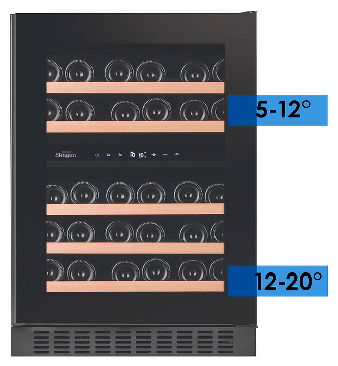 Винный шкаф Temptech Skagen SKX6070DRB предназначен для охлаждения, хранения и демонстрации бутилированного вина в отелях, винных магазинах, на предприятиях общественного питания и торговли. Модель оснащена 2 температурными зонами, внутренней светодиодной подсветкой, сенсорной панелью, цифровым дисплеем и активным вентилятором для равномерного распределения температуры. Дверца выполнена из стеклопакета с аргоном, полки - из натурального дерева. Особенности: