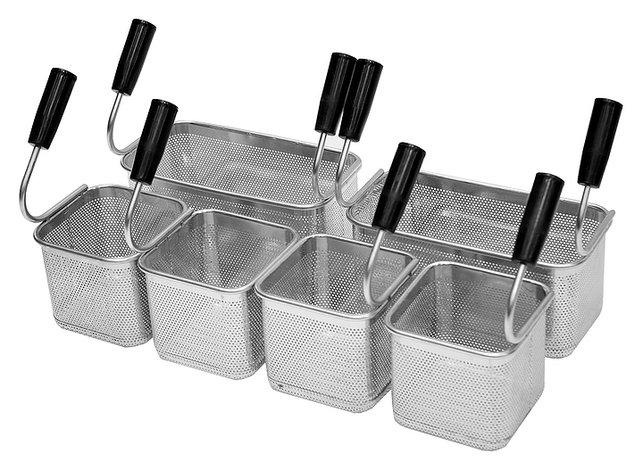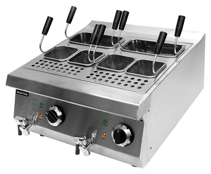 Макароноварка Kocateq 1M0CP1E класса Medium-Duty используется на предприятиях общественного питания и торговли для отваривания и размораживания кукурузы, фрикаделек, макаронных изделий, пельменей, вареников, овощей, фруктов и прочих продуктов. Модель оснащена механическим термостатом для регулировки температуры и защитным термостатом. Ванна выполнена из специальной стали толщиной 1,5 мм, декоративные ручки с накладками - из нержавеющей стали, поверхности, соприкасающиеся с продуктами, выполнены из нержавеющей стали AISI 304 толщиной 1 мм, дно и задняя стенка - из нержавеющей стали AISI 201 толщиной 1 мм. В комплект поставки входят 2 корзины 240x120x120 мм и 4 корзины 120x120x120 мм из нержавеющей стали AISI 304. Особенности: