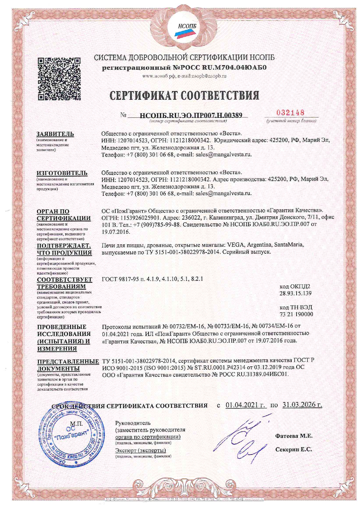 Компания Vesta производит печи-мангалы, открытые мангалы, искрогасители (гидрофильтры), дровяные печи для пиццы, коптильни, производственные столы из нержавеющей стали, кухонные стеллажи, моечные ванны и аксессуары. |
