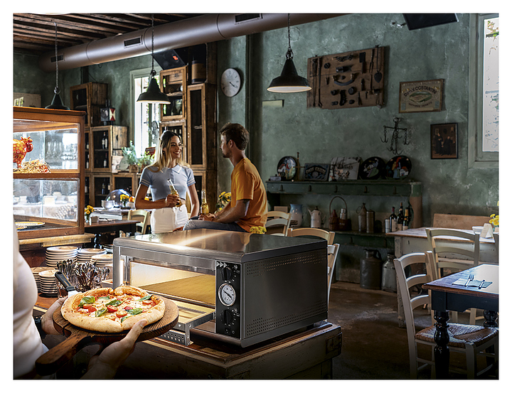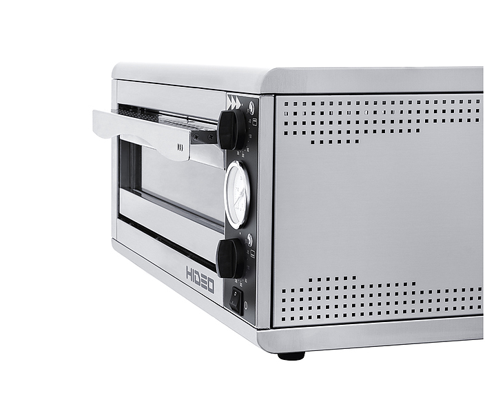 Электрическая печь Prismafood HIDEO 1/40 предназначена для выпекания и разогрева пиццы, а также приготовления других изделий, не требующих пароувлажнения: фокаччи, хачапури, слоек, запеченных овощей и запеканок на предприятиях общественного питания и торговли. Модель оснащена камерой с верхним и нижним трубчатыми электронагревателями (ТЭНами), откидной дверью с длинной горизонтальной рукояткой и расположенной с правой стороны фронта электромеханической панелью управления. Фронт и внутренняя облицовка камеры выполнены из высококачественной нержавеющей стали, прочие панели корпуса – из окрашенной стали. Особенности: