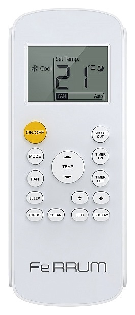 Настенная сплит-система Ferrum FIS24F2_ / FOS24F2_-WS40 серии F2 WS40 используется для создания максимально кофмортных условий микроклимата в жилых, вдминистративных и коммерческих помещениях. Модель состоит из внутреннего блока FIS24F2_ и наружного блока FOS24F2_-WS40. Наружный блок оснащен 3-лопастным вентилятором, защитными решеткой и крышкой для сервисных вентилей, внутренний блок – воздухозаборной решеткой, откидной лицевой панелью, подвижной горизонтальной заслонкой, электронным блоком управления и светодиодным дисплеем скрытого типа с проецируемой на фронтальную панель индикацией, пульт – кнопочной клавиатурой и информативным жидкокристаллическим дисплеем с фоновой подсветкой. Облицовка внутреннего блока выполнена из пластика с поверхностью белого цвета и декоративной окантовкой лицевой панели серебристого оттенка, корпус пульта – из ударопрочного белого пластика, корпус наружного блока – из стали с антикоррозийным покрытием белого цвета, теплообменники с гидрофобным антикоррозийным покрытием Golden Fin.