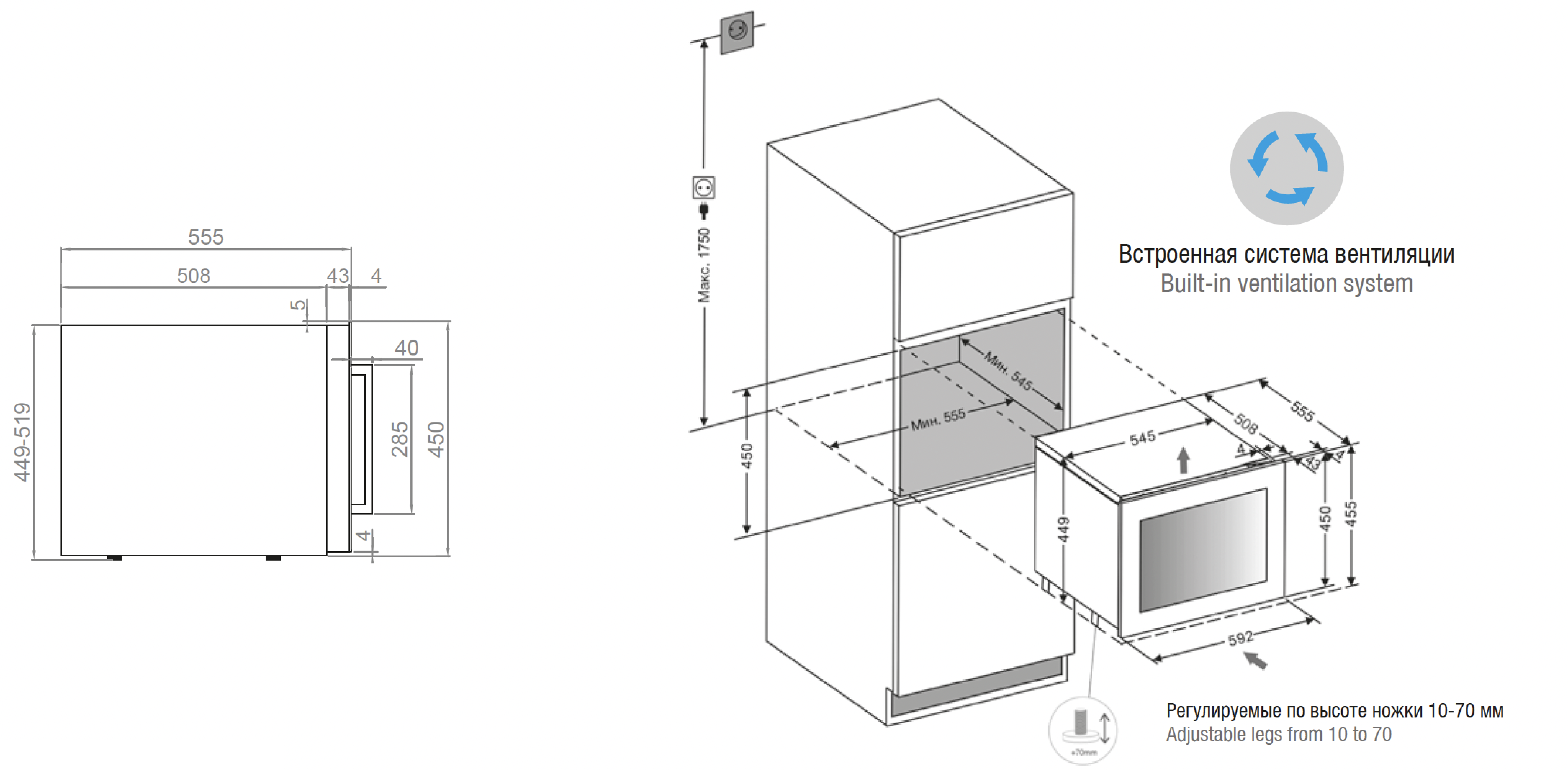 - Минимальные габариты ниши для встраивания: 555х545х450 мм