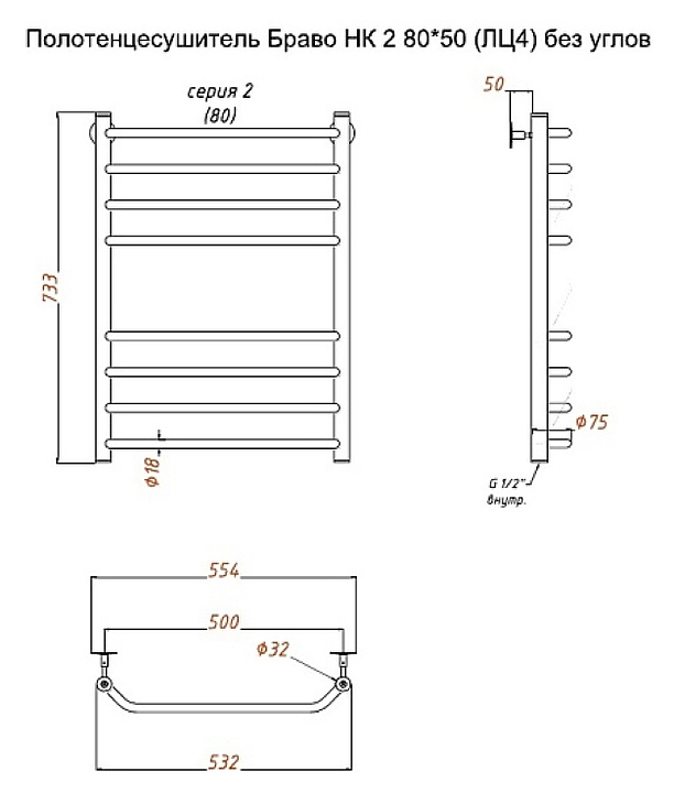 Полотенцесушитель водяной Тругор Браво НК 2 80х50 см (без углов), хром