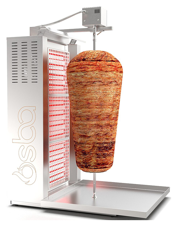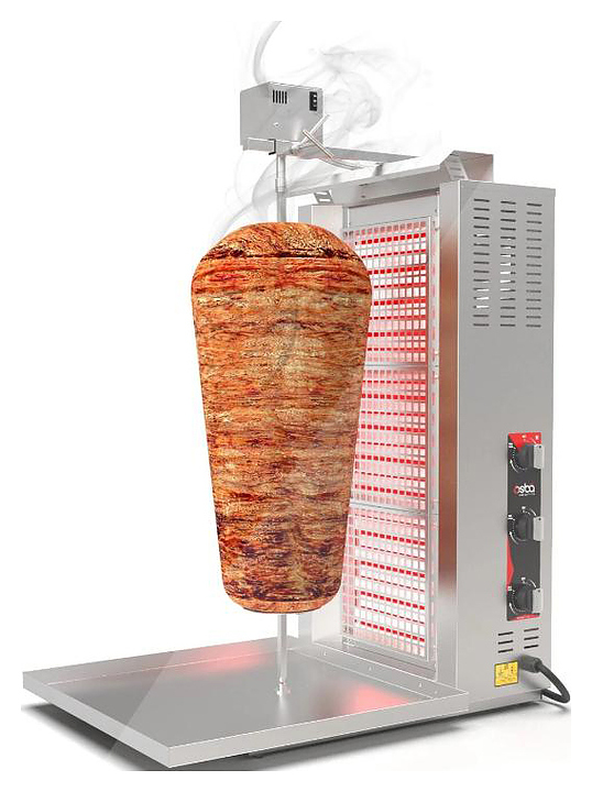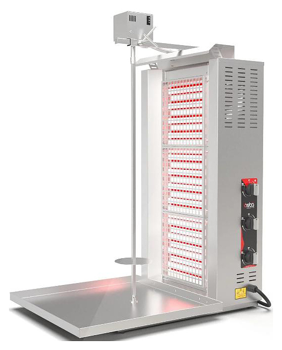 Электрический гриль Osba SH3-LE предназначен для обжарки большого количества различных видов мяса и птицы при приготовлении начинки для шаурмы, донера и других блюд на предприятиях общественного питания и торговли. Размещение на вертикальном вертеле и электрическое управление вращением обеспечивают равномерное приготовление. Модель оснащена защитным козырьком и 3 зонами нагрева, каждая из которых имеет индивидуальное управление с плавной регулировкой мощности. Перемещение вертела вперед и назад позволяет регулировать расстояние между мясом и нагревом при разном количестве заготовки. Корпус и решетка нагревателей выполнены из пищевой нержавеющей стали, которая отличается прочностью и долговечностью. Дополнительные характеристики: