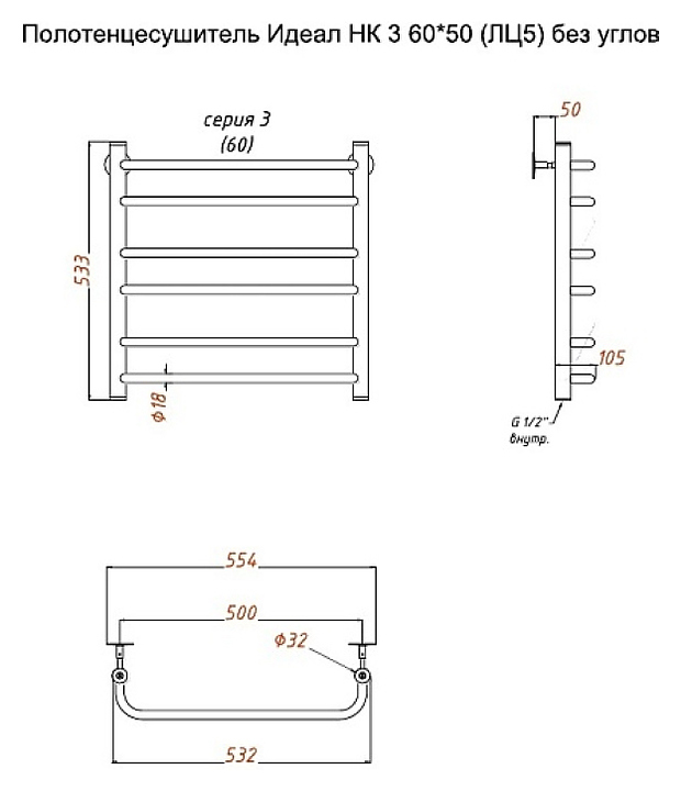 Полотенцесушитель водяной Тругор Идеал НК 3 60х50 см (без углов), хром