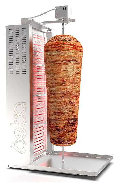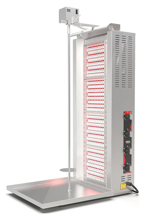 Электрический гриль Osba SH4-LE предназначен для обжарки большого количества различных видов мяса и птицы при приготовлении начинки для шаурмы, донера и других блюд на предприятиях общественного питания и торговли. Размещение на вертикальном вертеле и электрическое управление вращением обеспечивают равномерное приготовление. Модель оснащена защитным козырьком и 4 зонами нагрева, каждая из которых имеет индивидуальное управление с плавной регулировкой мощности. Перемещение вертела вперед и назад позволяет регулировать расстояние между мясом и нагревом при разном количестве заготовки. Корпус и решетка нагревателей выполнены из пищевой нержавеющей стали, которая отличается прочностью и долговечностьюи. Дополнительные характеристики: