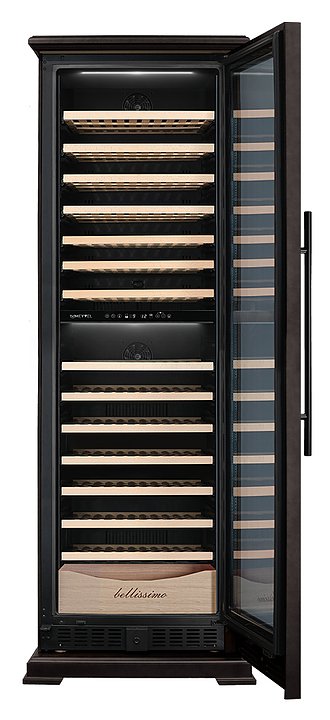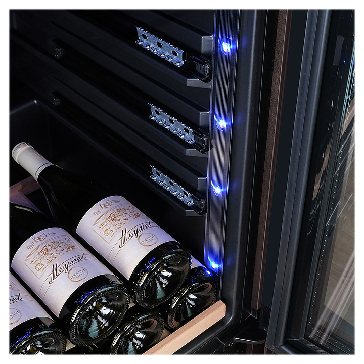 Винный шкаф MEYVEL MV163PRO-KBT2 предназначен для демонстрации, хранения и создания оптимальных условий для сохранения всех вкусовых свойств вина в бутылках на предприятиях общественного питания, торговли, в барах, ресторанах, специализированных магазинах, частных домах или квартирах. Модель оснащена интуитивно-понятной сенсорной панелью управления, электронным термостатом и внутренней светодиодной подсветкой. Корпус выполнен из стали с обшивкой из натурального шпона бука, дверь - из тройного стекла с УФ защитой, полки - из массива бука. Особенности: