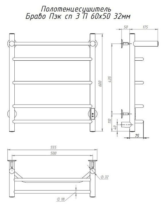 Полотенцесушитель электрический с полочкой Тругор Браво Пэк сп 3 П 60х50 см, хром