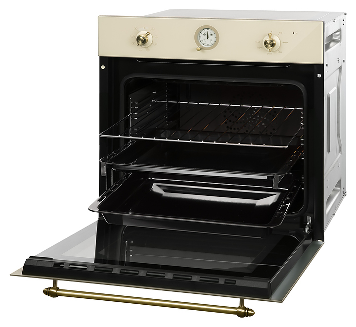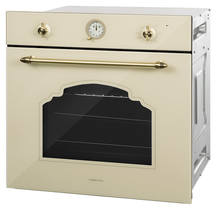 Встраиваемый электрический духовой шкаф Hiberg VM 6382 YR предназначен для приготовления большого ассортимента блюд в домашних условиях. Модель оснащена камерой с расположенными в задней стенке вентилятором и кольцевым нагревательным элементом, верхним и нижним нагревательными элементами, верхним грилем, 2 боковыми стойками с 5 уровнями направляющих для противней, откидной дверью с фигурным смотровым окном и горизонтальной рукояткой, кабелем питания, электромеханической панелью управления с 2 поворотными переключателями и круглым циферблатом с защитным стеклом. Корпус выполнен из высококачественной стали, верхняя панель и дверь бежевого оттенка с полным фронтальным остеклением из закаленного стекла без винтового крепежа, боковые стойки, направляющие и решетка для гриля – из металла с хромированным покрытием, противни – из металла с эмалированным покрытием, рукоятка трубчатой формы с декоративными наконечниками и фигурные ручки переключателей – из металла с поверхностью бронзового оттенка.