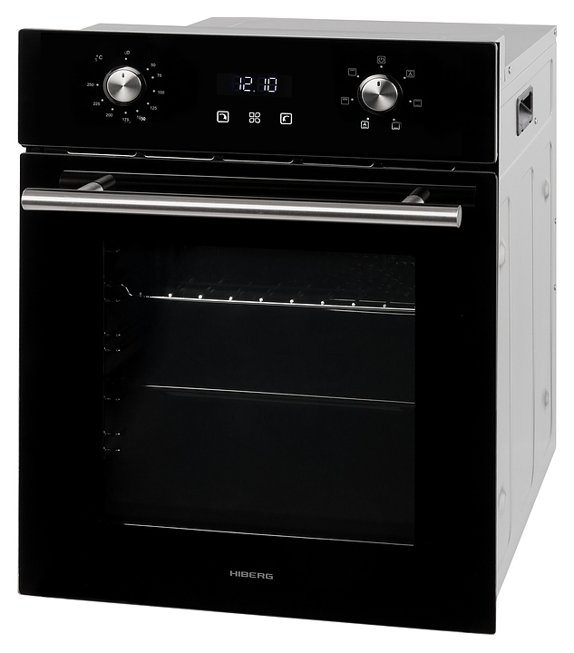 Встраиваемый электрический духовой шкаф Hiberg VM 4260 B предназначен для приготовления большого ассортимента блюд в гостиничных комплексах и домашних условиях. Модель оснащена камерой с расположенным в задней стенке вентилятором, верхним и нижним нагревательными элементами, верхним грилем, 2 боковыми стойками с 5 уровнями направляющих для противней, откидной дверью со смотровым окном и горизонтальной цилиндрической рукояткой, кабелем питания, электромеханической панелью управления с 2 цилиндрическими поворотными переключателями, функциональными сенсорными клавишами и светодиодным цифровым дисплеем с белой подсветкой индикации. Корпус выполнен из высококачественной стали, фронтальные панели с покрытием эмалью черного цвета и полным остеклением из закаленного стекла без винтового крепежа, противень – из металла с эмалированной поверхностью, боковые стойки и решетка для гриля – из металла с хромированным покрытием, фурнитура – из металла с серебристой поверхностью.