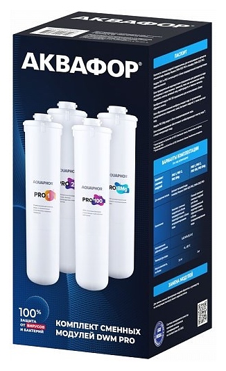 Комплект сменных модулей АКВАФОР Pro1-Pro2-Pro100-Pro BMg используется совместно с системами Морион DWM-102S Pro для эффективного удаления тяжелых металлов, бактерий, вирусов, пестицидов, остаточного хлора, антибиотиков, а также снижения жесткости воды.
