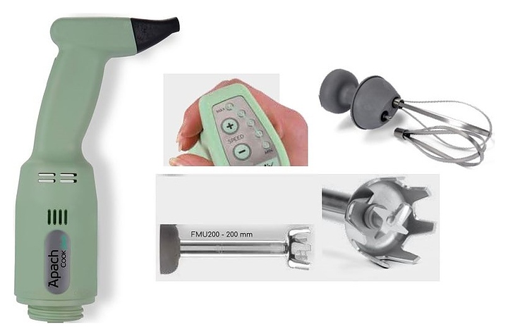 Погружной миксер Apach AHM250V200C Plus предназначен для измельчения и перемешивания продуктов до однородной массы, а также приготовления супов-пюре, майонеза, муссов и картофельного и овощного пюре на предприятиях общественного питания и торговли. Модель оснащена удобной панелью управления в верхней части ручки. Корпус моторного блока выполнен из пластика светло-зеленого цвета. Дополнительные характеристики: