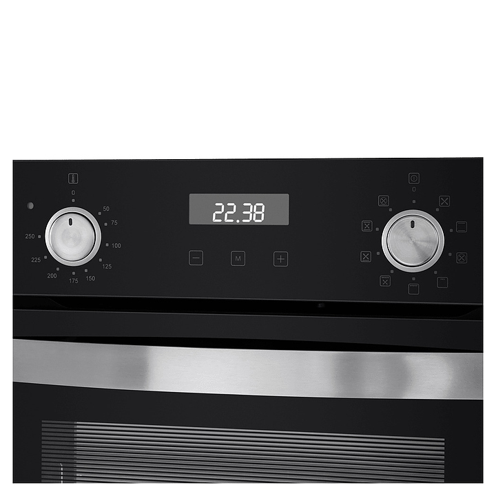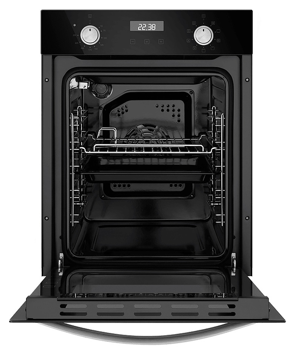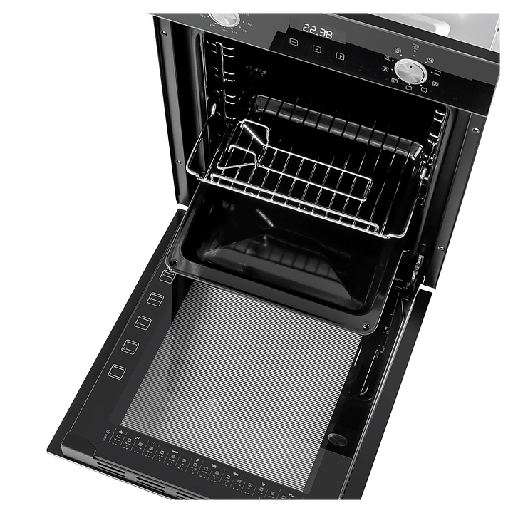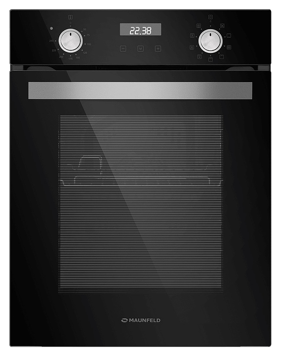 Встраивамый электрический духовой шкаф Maunfeld EOEM519B предназначен для приготовления большого ассортимента блюд в домашних условиях. Модель оснащена камерой с расположенными в задней стенке кольцевым нагревательным элементом и вентилятором, верхним и нижним нагревательными элементами, верхним грилем, 2 боковыми стойками с 5 уровнями направляющих для противней, откидной дверью со смотровым окном, уплощенной дугообразной горизонтальной рукояткой, кабелем питания с евровилкой, расположенной в верхней части фронта панелью управления с 2 поворотными цилиндрическими переключателями, сенсорными функциональными клавишами и светодиодным дисплеем с белой подсветкой индикации. Корпус выполнен из высококачественной стали, фронт с покрытием черного цвета и полным остеклением без винтового крепежа прозрачным закаленным стеклом, боковые стойки, решетка для гриля и прихват для противней – из металла с хромированной поверхностью, противень – из стали с эмалированным покрытием, рукоятка и переключатели – из металла с матовой поверхностью цвета нержавеющей стали.