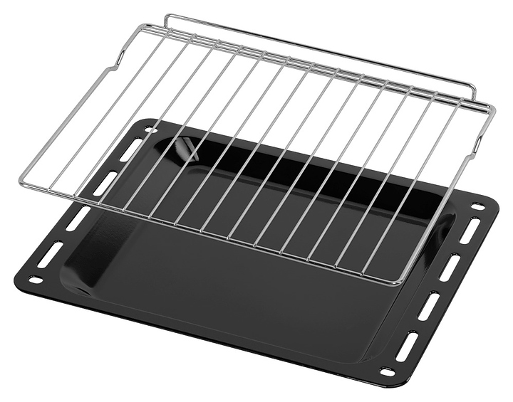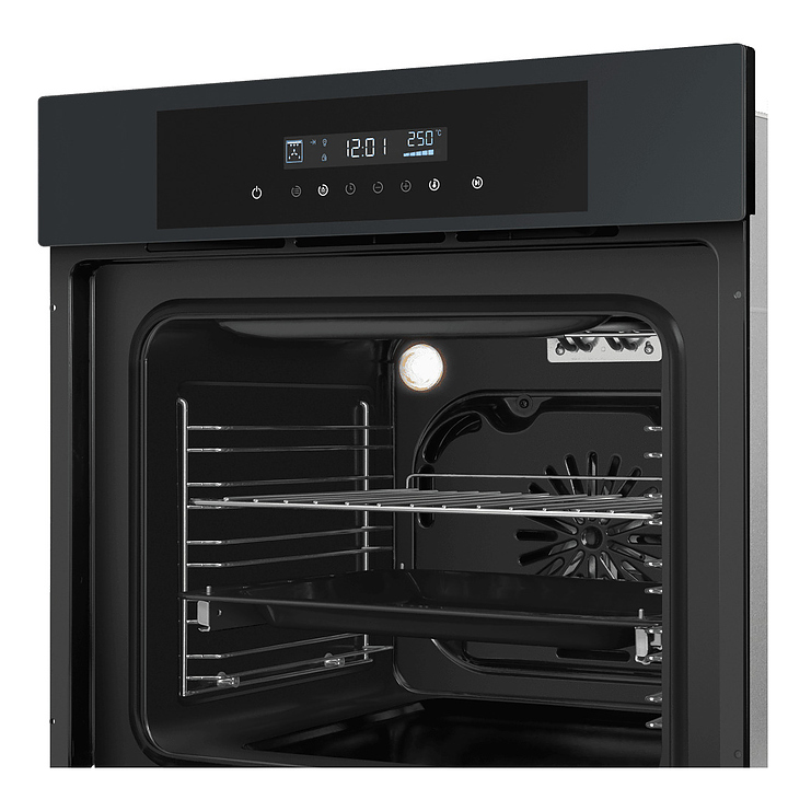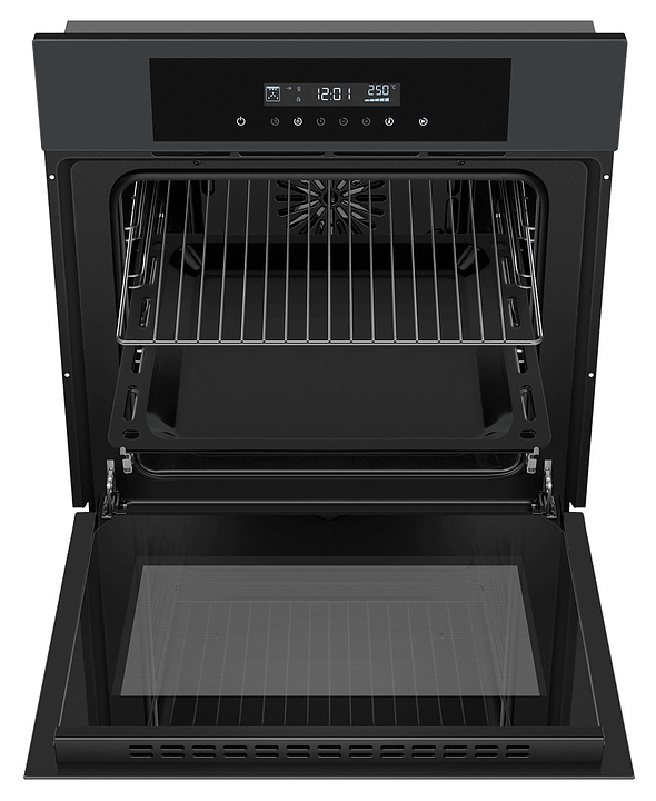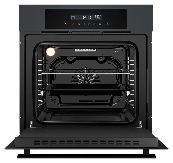 Встраивамый электрический духовой шкаф Maunfeld AEOD6063G1 предназначен для приготовления большого ассортимента блюд в домашних условиях. Модель оснащена камерой с расположенным в задней стенке вентилятором, верхним и нижним нагревательными элементами, верхним грилем, 2 боковыми стойками с 5 уровнями направляющих для противней, откидной дверью со смотровым окном, уплощенной горизонтальной рукояткой, кабелем питания с евровилкой, расположенной в верхней части фронта панелью управления с сенсорными функциональными клавишами и информативным дисплеем с белой подсветкой индикации. Корпус выполнен из высококачественной стали, верхняя фронтальная панель с покрытием оттенка графит, фронт двери с покрытием черного цвета, фронтальные панели с полным остеклением без винтового крепежа прозрачным закаленным стеклом, боковые стойки, направляющие, решетка для гриля и прихват для противней – из металла с хромированной поверхностью, противень – из стали с эмалированным покрытием, верхняя фронтальная панель и рукоятка – из металла с черной матовой поверхностью.