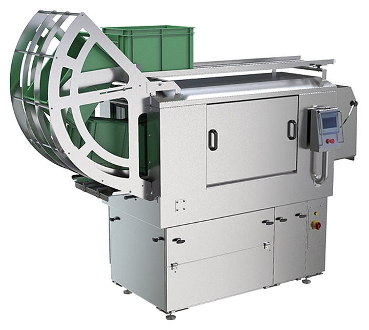 Тоннельная машина Азимут ММТТ-150 предназначена для мойки и дезинфекции оборотной пластиковой тары в производственных цехах. Процесс очистки состоит из основной мойки и ополаскивания. Модель оснащена высокопроизводительны насосом, распыляющим моющий раствор через форсунки. Корпус выполнен из нержавеющей стали AISI 304. Особенности: