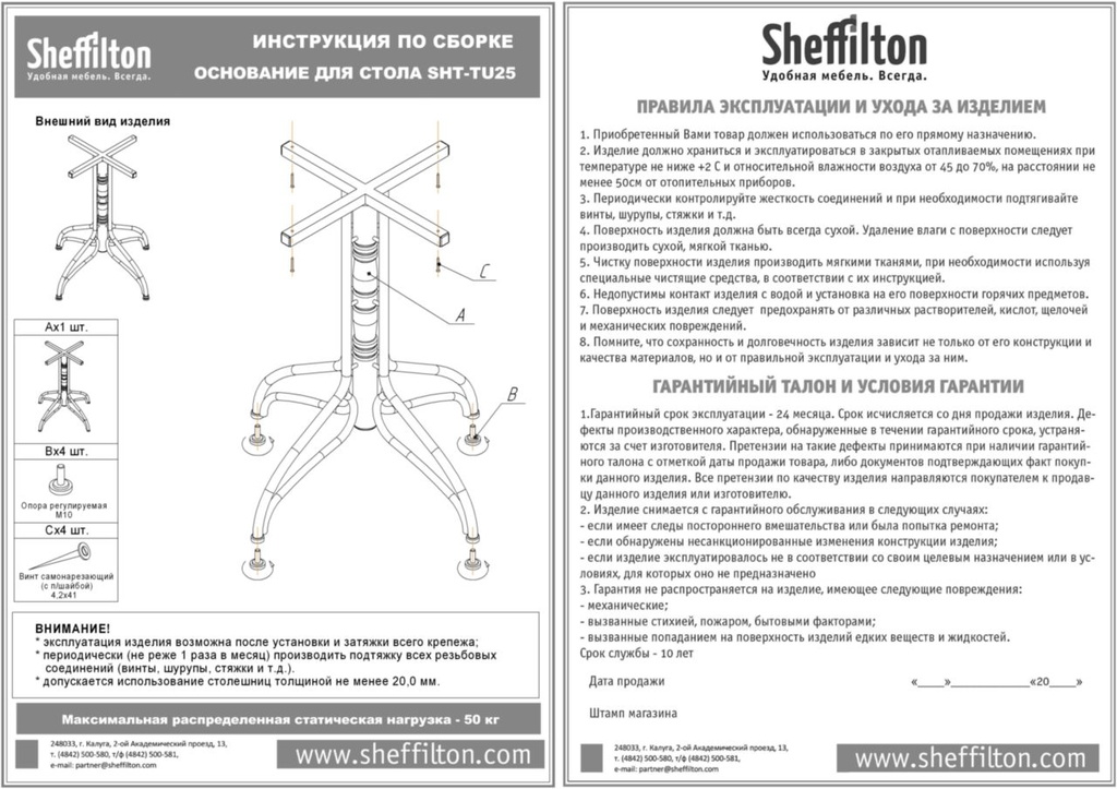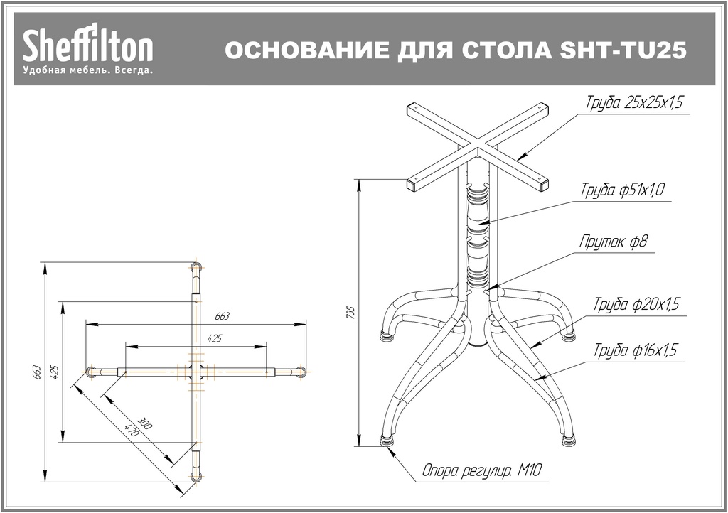 Подстолье Sheffilton SHT-TU25 используется в качестве опоры для столешницы обеденного столика в кафе, ресторанах и на других предприятиях общественного питания и торговли. Модель имеет устойчивую конструкцию из несущей крестовины, состоящих из труб круглого сечения опорной стойки и 4 изящно изогнутых ножек. Компоненты выполнены из металла с покрытием порошковой краской оттенка черный муар, центральная труба стойки с декоративной рельефной формовкой, несущая крестовина – из профиля трубы квадратного сечения, заглушки крестовины – из черного пластика, упаковка – из картона и полиэтилена. Цена указана за 1 шт. Особенности:
