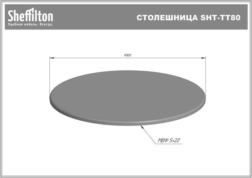 Столешница Sheffilton SHT-TT 80 используется совместно с подстольями соответствующих размеров для обеденных столиков в кафе, ресторанах и на других предприятиях общественного питания и торговли. Модель круглой формы выполнена из древесноволокнистой плиты средней плотности (МДФ) без содержания токсичных примесей с лицевой поверхностью оттенка голубой бетон, упаковка – из картона. Цена указана за 1 шт. Особенности: