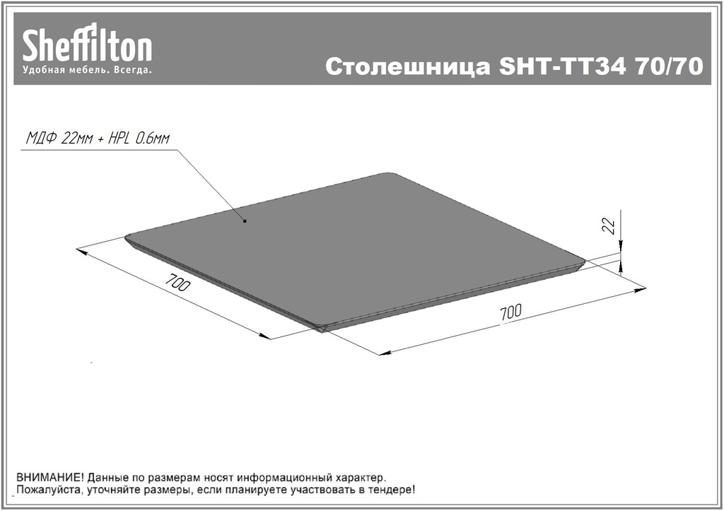 Столешница Sheffilton SHT-TT34 70/70 используется совместно с подстольями соответствующих размеров для обеденных столиков в кафе, ресторанах и на других предприятиях общественного питания и торговли. Лицевая поверхность квадратной формы выполнена из ламината высокого давления (HPL) белого цвета, основание –из фанеры со скошенными книзу торцами, упаковка – из картона. Цена указана за 1 шт. Особенности: