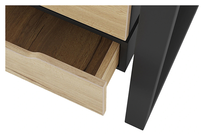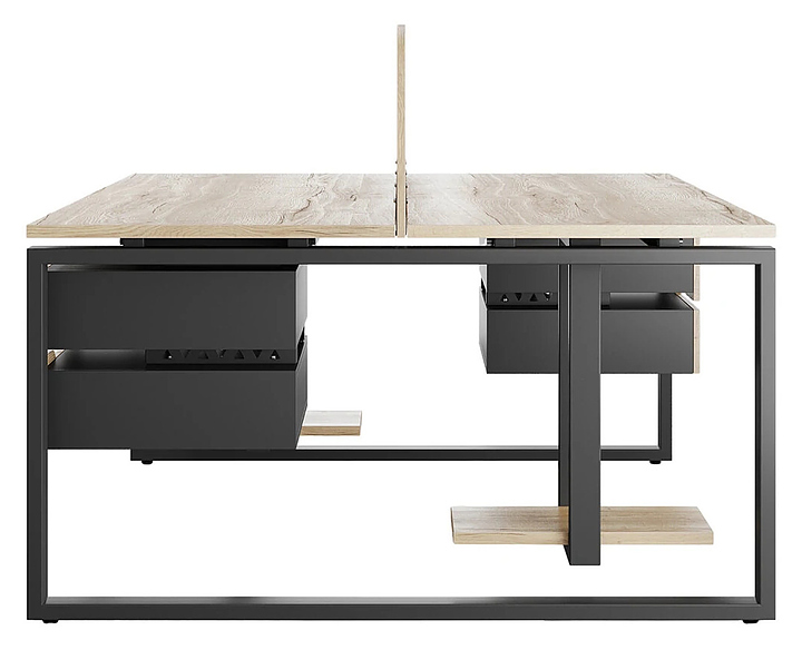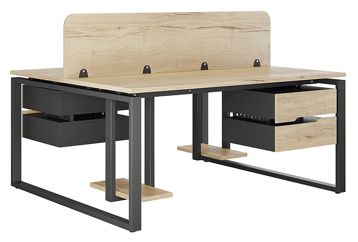 Офисный стол Кобор O1/2-180/160 black/natural на 2 рабочих места используется в офисных помещениях и кабинетах руководителей. Модель оснащена O-образными опорами. Каркас и опоры выполнены из металла, выкрашенного в цвет черный муар (RAL9005), столешница – из ламинированной древесно-стружечной плиты (ЛДСП) цвета натуральный дуб (H1180 ST37). Дополнительные характеристики: