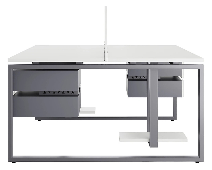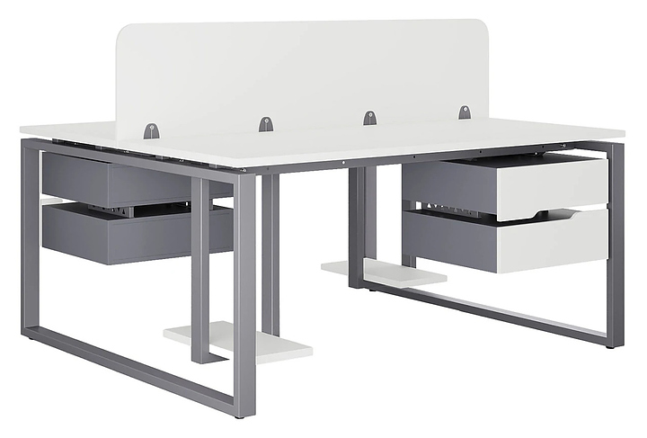 Офисный стол Кобор O1/2-140/120 graphite/premium на 2 рабочих места используется в офисных помещениях и кабинетах руководителей. Модель оснащена O-образными опорами. Каркас и опоры выполнены из металла, выкрашенного в цвет графит муар (RAL7024), столешница – из ламинированной древесно-стружечной плиты (ЛДСП) цвета белый премиум (W1000 ST9). Дополнительные характеристики: