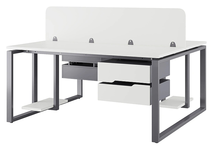 Офисный стол Кобор O1/2-160/120 graphite/premium на 2 рабочих места используется в офисных помещениях и кабинетах руководителей. Модель оснащена O-образными опорами. Каркас и опоры выполнены из металла, выкрашенного в цвет графит муар (RAL7024), столешница – из ламинированной древесно-стружечной плиты (ЛДСП) цвета белый премиум (W1000 ST9). Дополнительные характеристики: