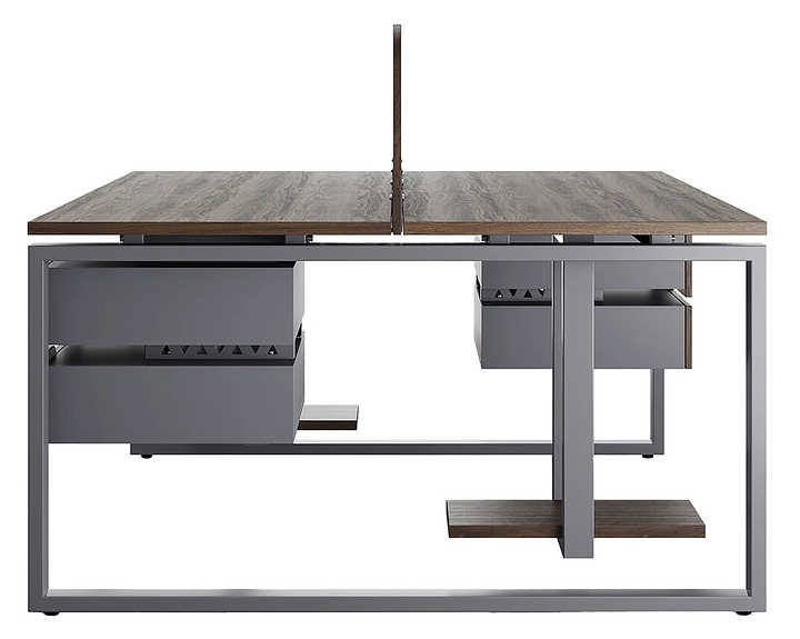 Офисный стол Кобор O1/2-140/160 graphite/charlston на 2 рабочих места используется в офисных помещениях и кабинетах руководителей. Модель оснащена O-образными опорами. Каркас и опоры выполнены из металла, выкрашенного в цвет графит муар (RAL7024), столешница – из ламинированной древесно-стружечной плиты (ЛДСП) цвета дуб чарльстон (H3154 ST36). Дополнительные характеристики: