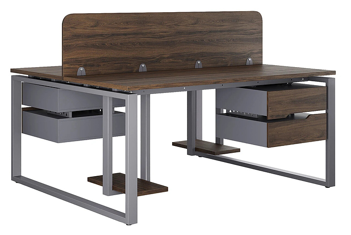 Офисный стол Кобор O1/2-180/160 graphite/charlston на 2 рабочих места используется в офисных помещениях и кабинетах руководителей. Модель оснащена O-образными опорами. Каркас и опоры выполнены из металла, выкрашенного в цвет графит муар (RAL7024), столешница – из ламинированной древесно-стружечной плиты (ЛДСП) цвета дуб чарльстон (H3154 ST36). Дополнительные характеристики: