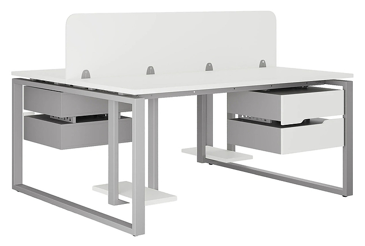Офисный стол Кобор O1/2-180/140 aluminum/premium на 2 рабочих места используется в офисных помещениях и кабинетах руководителей. Модель оснащена O-образными опорами. Каркас и опоры выполнены из металла, выкрашенного в цвет алюминиевый металлик (RAL9006), столешница – из ламинированной древесно-стружечной плиты (ЛДСП) цвета белый премиум (W1000 ST9). Дополнительные характеристики: