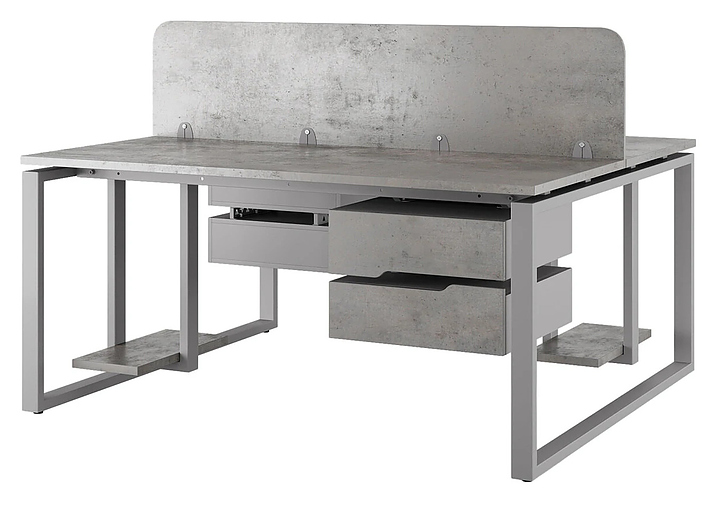Офисный стол Кобор O1/2-140/140 aluminum/chicago на 2 рабочих места используется в офисных помещениях и кабинетах руководителей. Модель оснащена O-образными опорами. Каркас и опоры выполнены из металла, выкрашенного в цвет алюминиевый металлик (RAL9006), столешница – из ламинированной древесно-стружечной плиты (ЛДСП) цвета бетон чикаго (F186 ST9). Дополнительные характеристики: