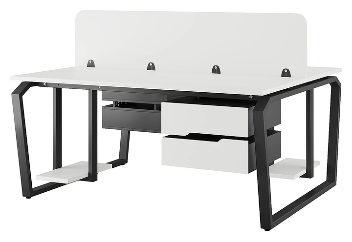Офисный стол Кобор TB/2-140/160 black/premium на 2 рабочих места используется в офисных помещениях и кабинетах руководителей. Модель оснащена опорами в форме обратной трапеции со скошенными верхними углами. Каркас и опоры выполнены из металла, выкрашенного в цвет черный муар (RAL9005), столешница – из ламинированной древесно-стружечной плиты (ЛДСП) цвета белый премиум (W1000 ST9). Дополнительные характеристики: