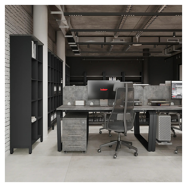 Офисный стол Кобор TB/2-160/120 black/chicago на 2 рабочих места используется в офисных помещениях и кабинетах руководителей. Модель оснащена опорами в форме обратной трапеции со скошенными верхними углами. Каркас и опоры выполнены из металла, выкрашенного в цвет черный муар (RAL9005), столешница – из ламинированной древесно-стружечной плиты (ЛДСП) цвета бетон чикаго (F186 ST9). Дополнительные характеристики:
