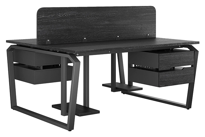 Офисный стол Кобор TB/2-180/160 black/glazed на 2 рабочих места используется в офисных помещениях и кабинетах руководителей. Модель оснащена опорами в форме обратной трапеции со скошенными верхними углами. Каркас и опоры выполнены из металла, выкрашенного в цвет черный муар (RAL9005), столешница – из ламинированной древесно-стружечной плиты (ЛДСП) цвета черный дуб (H3178 ST37). Дополнительные характеристики: