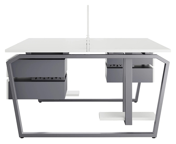 Офисный стол Кобор TB/2-120/140 graphite/premium на 2 рабочих места используется в офисных помещениях и кабинетах руководителей. Модель оснащена опорами в форме обратной трапеции со скошенными верхними углами. Каркас и опоры выполнены из металла, выкрашенного в цвет графит муар (RAL7024), столешница – из ламинированной древесно-стружечной плиты (ЛДСП) цвета белый премиум (W1000 ST9). Дополнительные характеристики: