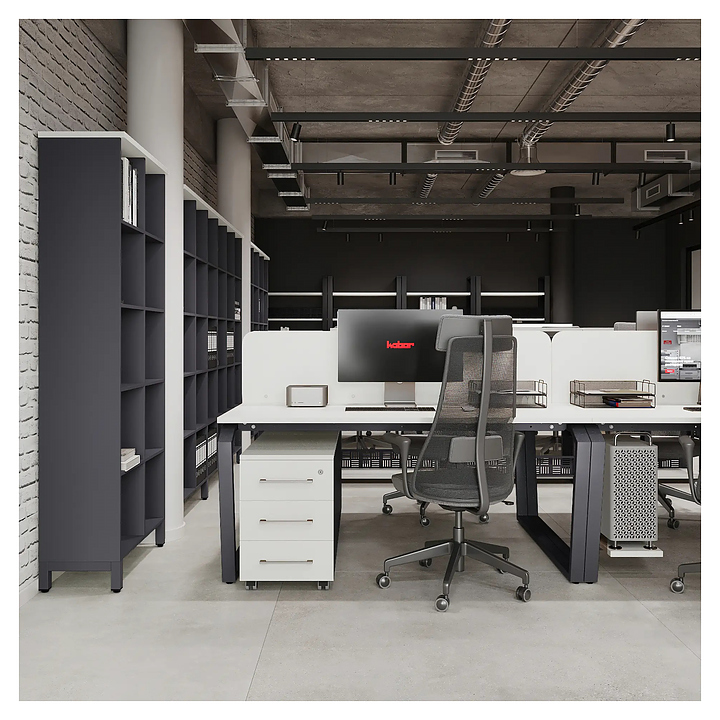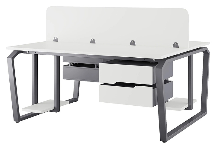 Офисный стол Кобор TB/2-140/140 graphite/premium на 2 рабочих места используется в офисных помещениях и кабинетах руководителей. Модель оснащена опорами в форме обратной трапеции со скошенными верхними углами. Каркас и опоры выполнены из металла, выкрашенного в цвет графит муар (RAL7024), столешница – из ламинированной древесно-стружечной плиты (ЛДСП) цвета белый премиум (W1000 ST9). Дополнительные характеристики: