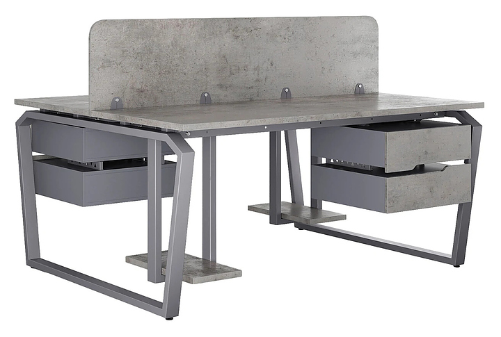 Офисный стол Кобор TB/2-120/140 graphite/chicago на 2 рабочих места используется в офисных помещениях и кабинетах руководителей. Модель оснащена опорами в форме обратной трапеции со скошенными верхними углами. Каркас и опоры выполнены из металла, выкрашенного в цвет графит муар (RAL7024), столешница – из ламинированной древесно-стружечной плиты (ЛДСП) цвета бетон чикаго (F186 ST9). Дополнительные характеристики: