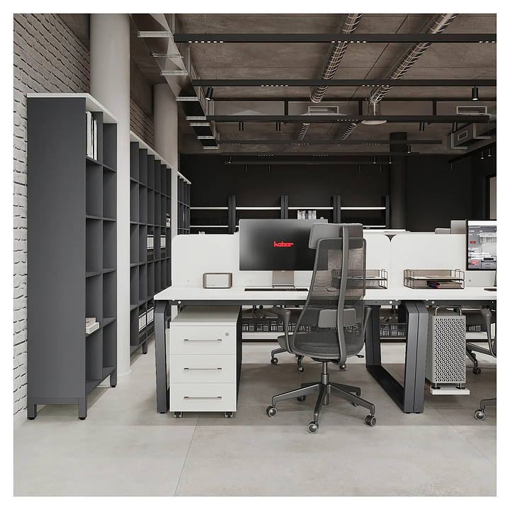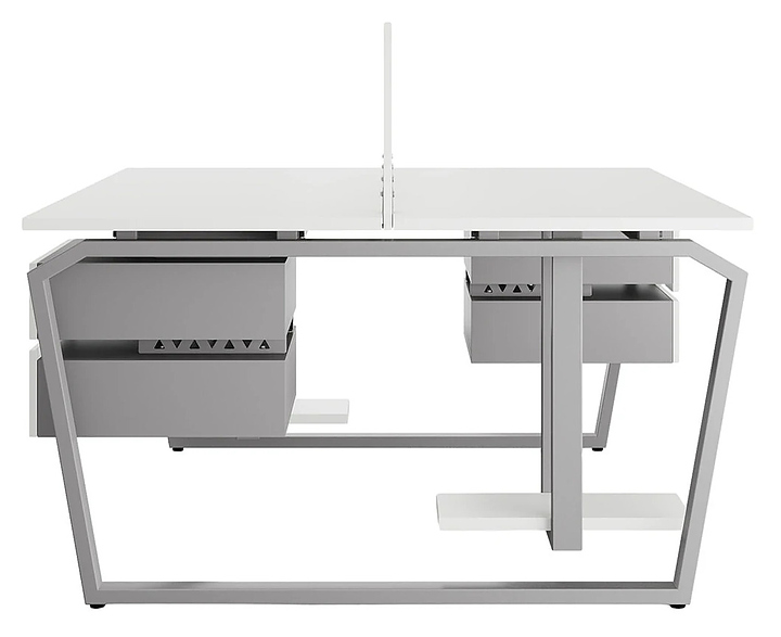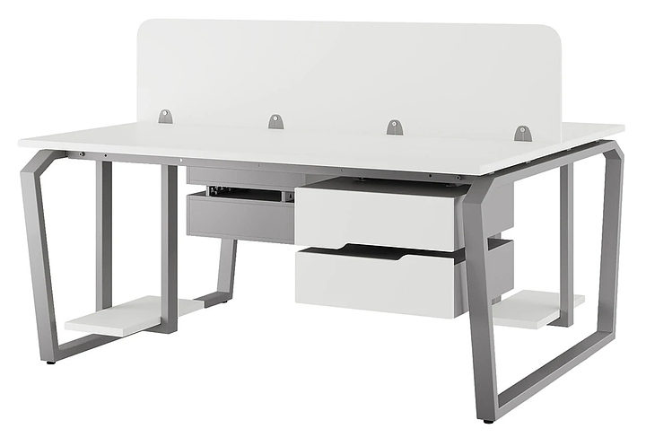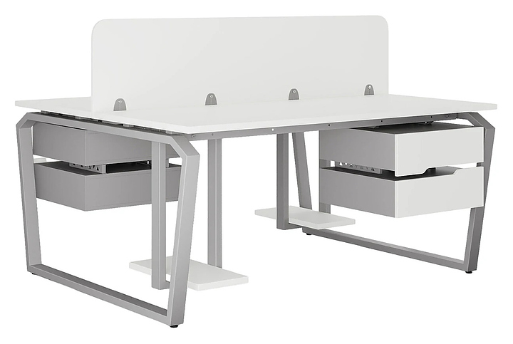 Офисный стол Кобор TB/2-180/140 aluminum/premium на 2 рабочих места используется в офисных помещениях и кабинетах руководителей. Модель оснащена опорами в форме обратной трапеции со скошенными верхними углами. Каркас и опоры выполнены из металла, выкрашенного в цвет алюминиевый металлик (RAL9006), столешница – из ламинированной древесно-стружечной плиты (ЛДСП) цвета белый премиум (W1000 ST9). Дополнительные характеристики: