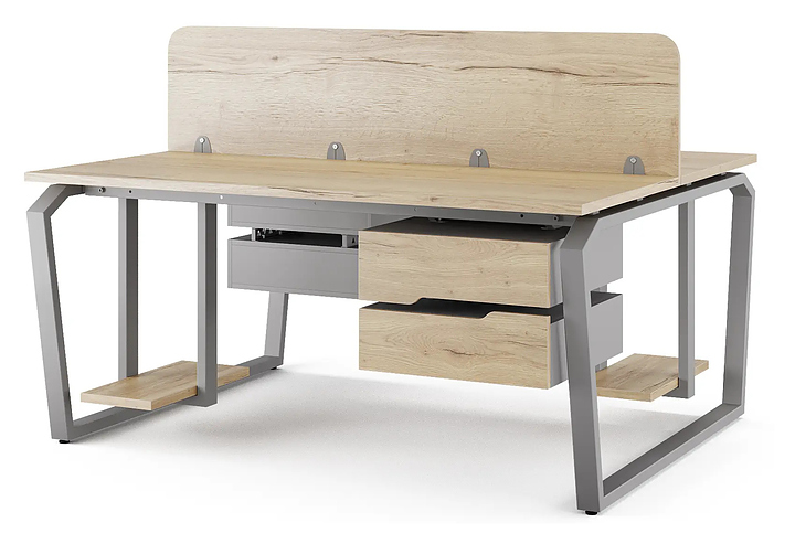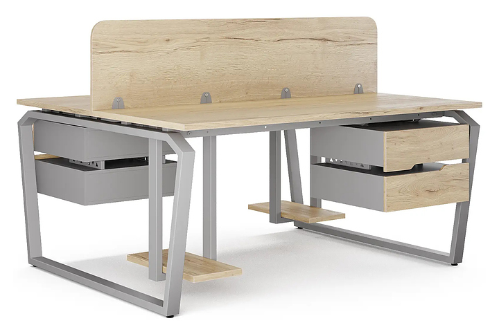 Офисный стол Кобор TB/2-160/120 aluminum/natural на 2 рабочих места используется в офисных помещениях и кабинетах руководителей. Модель оснащена опорами в форме обратной трапеции со скошенными верхними углами. Каркас и опоры выполнены из металла, выкрашенного в цвет алюминиевый металлик (RAL9006), столешница – из ламинированной древесно-стружечной плиты (ЛДСП) цвета натуральный дуб (H1180 ST37). Дополнительные характеристики: