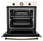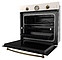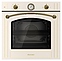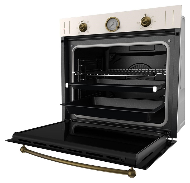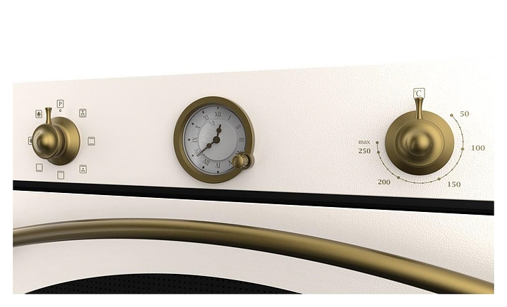 Встраивамый электрический духовой шкаф HiSTORY OE778B.RBG предназначен для приготовления большого ассортимента блюд в домашних условиях. Модель оснащена камерой с расположенным в задней стенке вентилятором, верхним и нижним нагревательными элементами, верхним грилем, боковыми стойками с 6 уровнями направляющих для противней, откидной дверью с фигурным смотровым окном, горизонтальной дугообразно изогнутой трубчатой рукояткой, кабелем питания с вилкой, расположенной в верхней части фронта электромеханической панелью управления с 2 поворотными переключателями и круглым циферблатом. Корпус выполнен из высококачественной стали, фасад двери и верхняя фронтальная панель с покрытием бежевого оттенка, боковые стойки, направляющие и решетка для гриля – из стали с хромированной поверхностью, противни – из стали с эмалированным покрытием, рукоятка и переключатели – из металла с золотистой поверхностью и декоративными рустикальными наконечниками.