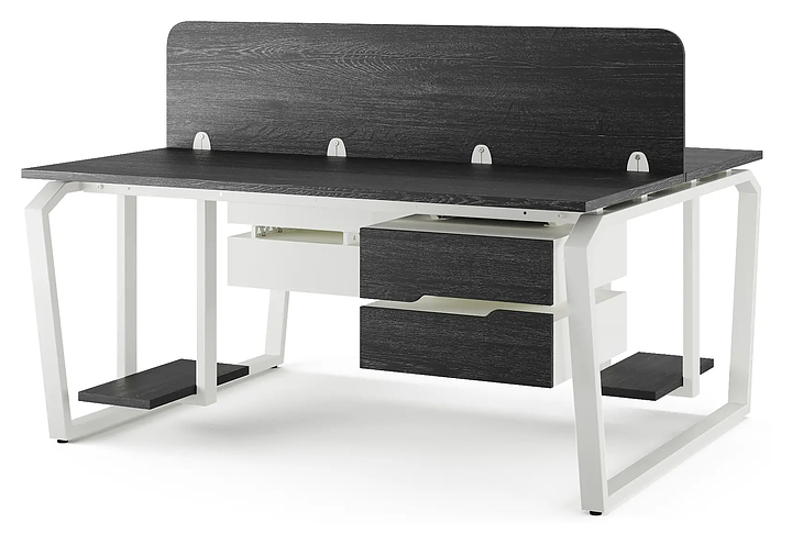 Офисный стол Кобор TB/2-100/160 white/glazed на 2 рабочих места используется в офисных помещениях и кабинетах руководителей. Модель оснащена опорами в форме обратной трапеции со скошенными верхними углами. Каркас и опоры выполнены из металла, выкрашенного в цвет белый муар (RAL9016), столешница – из ламинированной древесно-стружечной плиты (ЛДСП) цвета черный дуб (H3178 ST37). Дополнительные характеристики: