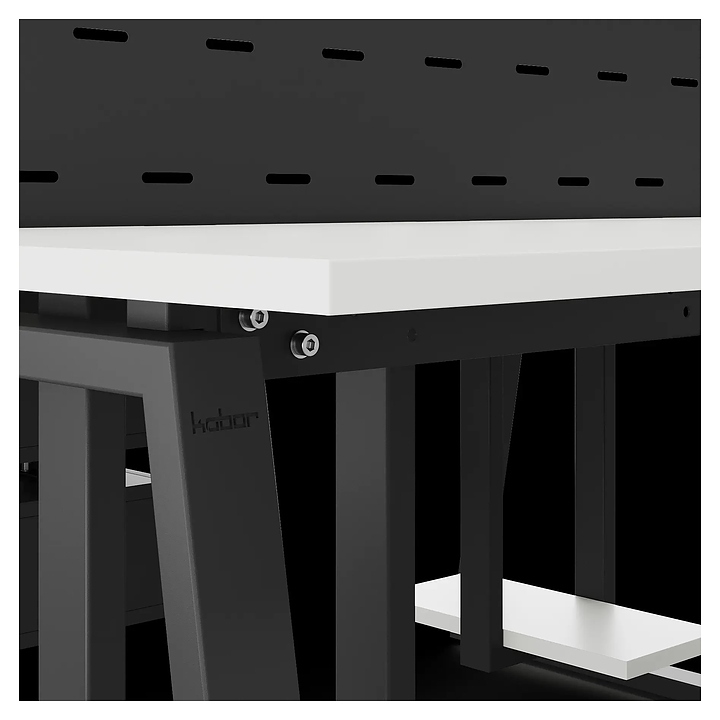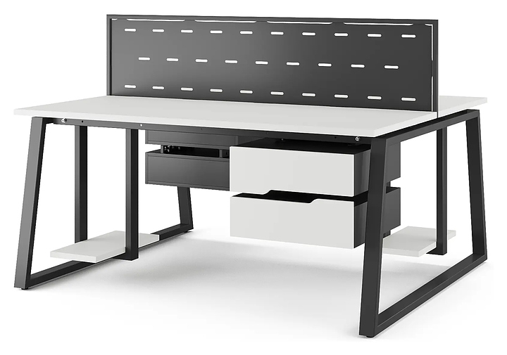 Офисный стол Кобор TR/2-100/160 black/premium на 2 рабочих места используется в офисных помещениях и кабинетах руководителей. Модель оснащена опорами в форме трапеции. Каркас и опоры выполнены из металла, выкрашенного в цвет черный муар (RAL9005), столешница – из ламинированной древесно-стружечной плиты (ЛДСП) цвета белый премиум (W1000 ST9). Дополнительные характеристики: