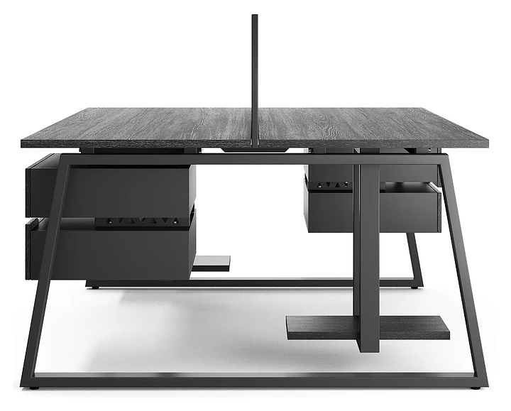 Офисный стол Кобор TR/2-120/160 black/glazed на 2 рабочих места используется в офисных помещениях и кабинетах руководителей. Модель оснащена опорами в форме трапеции. Каркас и опоры выполнены из металла, выкрашенного в цвет черный муар (RAL9005), столешница – из ламинированной древесно-стружечной плиты (ЛДСП) цвета черный дуб (H3178 ST37). Дополнительные характеристики:
