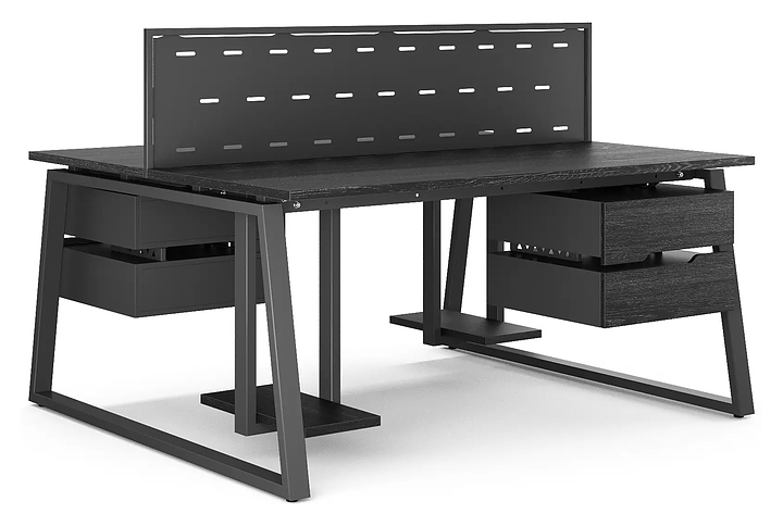 Офисный стол Кобор TR/2-140/160 black/glazed на 2 рабочих места используется в офисных помещениях и кабинетах руководителей. Модель оснащена опорами в форме трапеции. Каркас и опоры выполнены из металла, выкрашенного в цвет черный муар (RAL9005), столешница – из ламинированной древесно-стружечной плиты (ЛДСП) цвета черный дуб (H3178 ST37). Дополнительные характеристики: