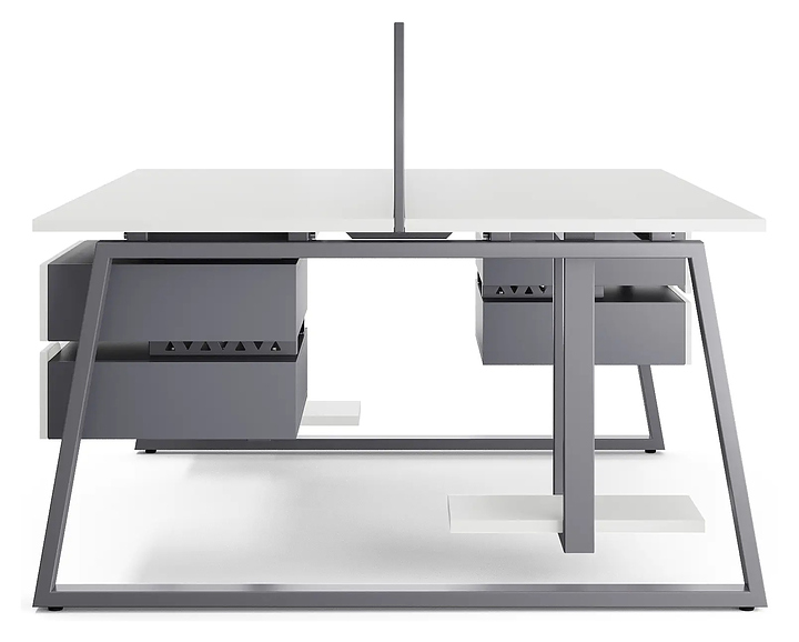 Офисный стол Кобор TR/2-180/120 graphite/premium на 2 рабочих места используется в офисных помещениях и кабинетах руководителей. Модель оснащена опорами в форме трапеции. Каркас и опоры выполнены из металла, выкрашенного в цвет графит муар (RAL7024), столешница – из ламинированной древесно-стружечной плиты (ЛДСП) цвета белый премиум (W1000 ST9). Дополнительные характеристики: