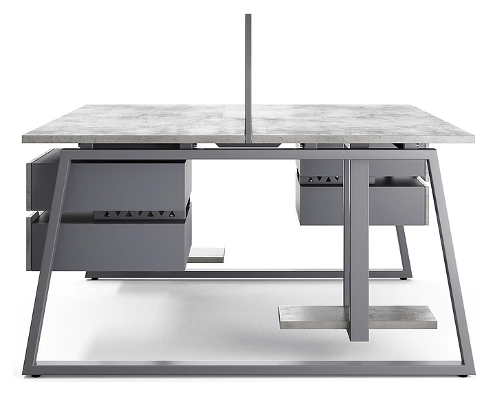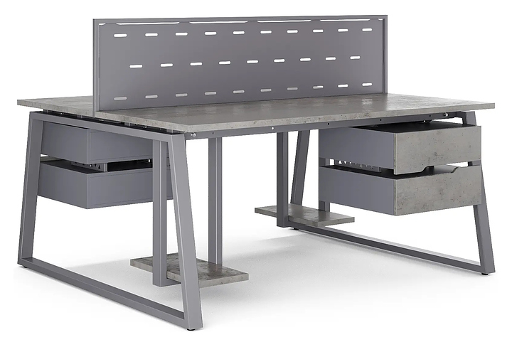 Офисный стол Кобор TR/2-180/160 graphite/chicago на 2 рабочих места используется в офисных помещениях и кабинетах руководителей. Модель оснащена опорами в форме трапеции. Каркас и опоры выполнены из металла, выкрашенного в цвет графит муар (RAL7024), столешница – из ламинированной древесно-стружечной плиты (ЛДСП) цвета бетон чикаго (F186 ST9). Дополнительные характеристики: