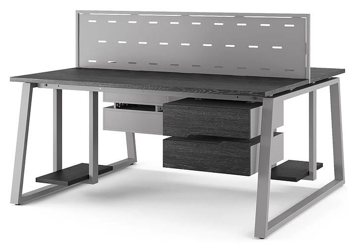 Офисный стол Кобор TR/2-140/120 aluminum/glazed на 2 рабочих места используется в офисных помещениях и кабинетах руководителей. Модель оснащена опорами в форме трапеции. Каркас и опоры выполнены из металла, выкрашенного в цвет алюминиевый металлик (RAL9006), столешница – из ламинированной древесно-стружечной плиты (ЛДСП) цвета черный дуб (H3178 ST37). Дополнительные характеристики: