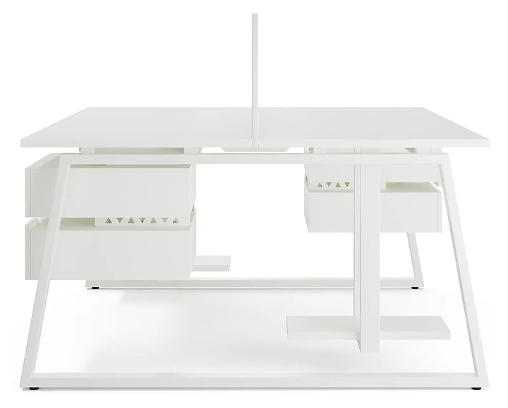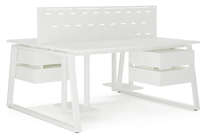 Офисный стол Кобор TR/2-160/120 white/premium на 2 рабочих места используется в офисных помещениях и кабинетах руководителей. Модель оснащена опорами в форме трапеции. Каркас и опоры выполнены из металла, выкрашенного в цвет белый муар (RAL9016), столешница – из ламинированной древесно-стружечной плиты (ЛДСП) цвета белый премиум (W1000 ST9). Дополнительные характеристики: