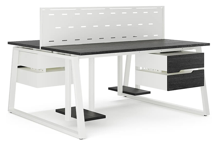 Офисный стол Кобор TR/2-120/120 white/glazed на 2 рабочих места используется в офисных помещениях и кабинетах руководителей. Модель оснащена опорами в форме трапеции. Каркас и опоры выполнены из металла, выкрашенного в цвет белый муар (RAL9016), столешница – из ламинированной древесно-стружечной плиты (ЛДСП) цвета черный дуб (H3178 ST37). Дополнительные характеристики: